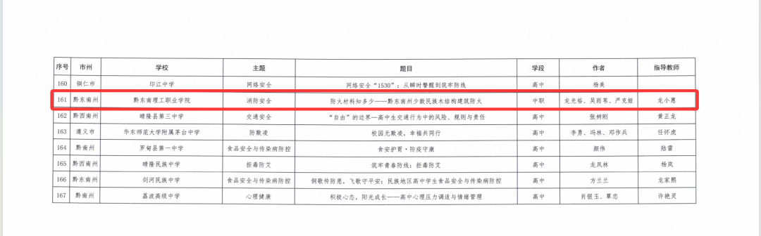近日,由贵州省教育厅主办的“2025年中小学(幼儿园)安全教育优秀案例评选活动”结果揭晓。党委宣传统战部龙光裕、吴雨苇、严克娅老师和指导教师龙小惠设计并实施的《防火材料知多少——黔东南州少数民族木结构建筑防火》教学设计,凭借其鲜明的特色、创新的设计与显著的育人实效,在全省众多参评设计中脱颖而出,成功入选省级优秀设计。