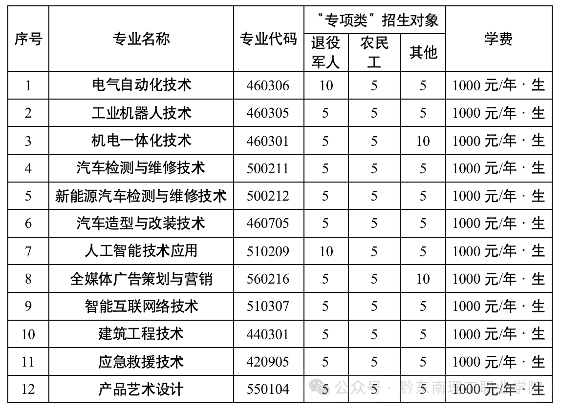 五、黔东南理工职业学院2026年分类考试“专项类”招生计划
