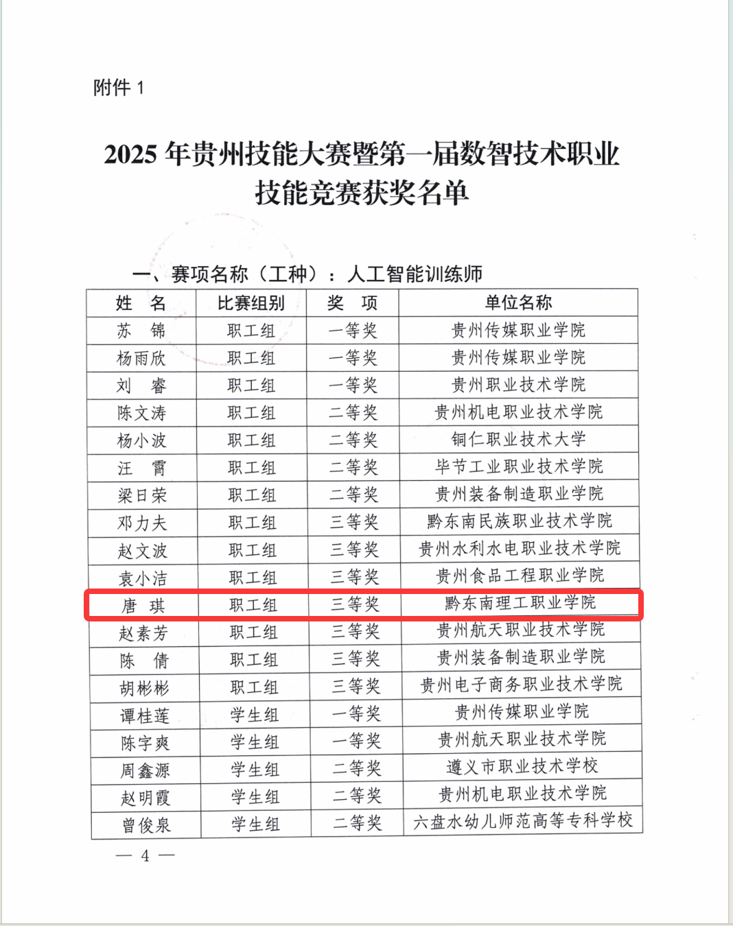 近日,由贵州省大数据发展管理局、贵州省教育厅、贵州省人力资源和社会保障厅、贵州省总工会、共青团贵州省委五部门联合举办的“贵州省技能大赛暨第一届数智技术职业技能竞赛”圆满落幕。学院信息工程系唐琪老师,凭借扎实的专业功底、精湛的技术能力和出色的现场发挥,在激烈的竞争中脱颖而出,荣获大赛三等奖。