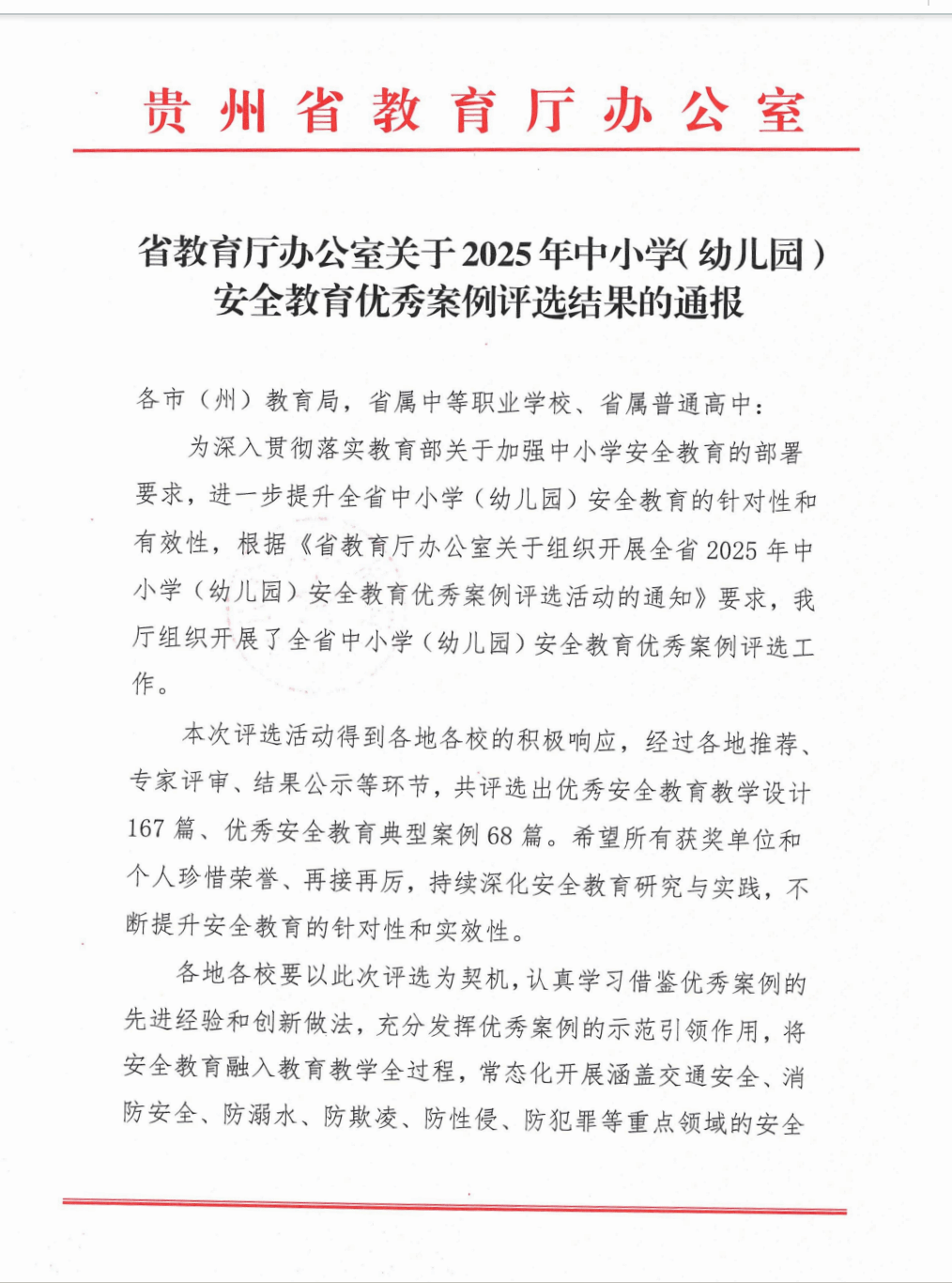 近日,由贵州省教育厅主办的“2025年中小学(幼儿园)安全教育优秀案例评选活动”结果揭晓。党委宣传统战部龙光裕、吴雨苇、严克娅老师和指导教师龙小惠设计并实施的《防火材料知多少——黔东南州少数民族木结构建筑防火》教学设计,凭借其鲜明的特色、创新的设计与显著的育人实效,在全省众多参评设计中脱颖而出,成功入选省级优秀设计。